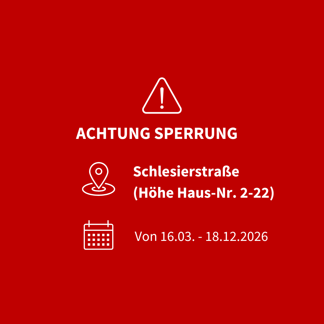 In der Schlesierstraße auf Höhe der Hausnummern 2-22 erfolgt ab Montag, 16.03.2026 bis 18.12.2026 eine Gesamtsperrung für den Verkehr.